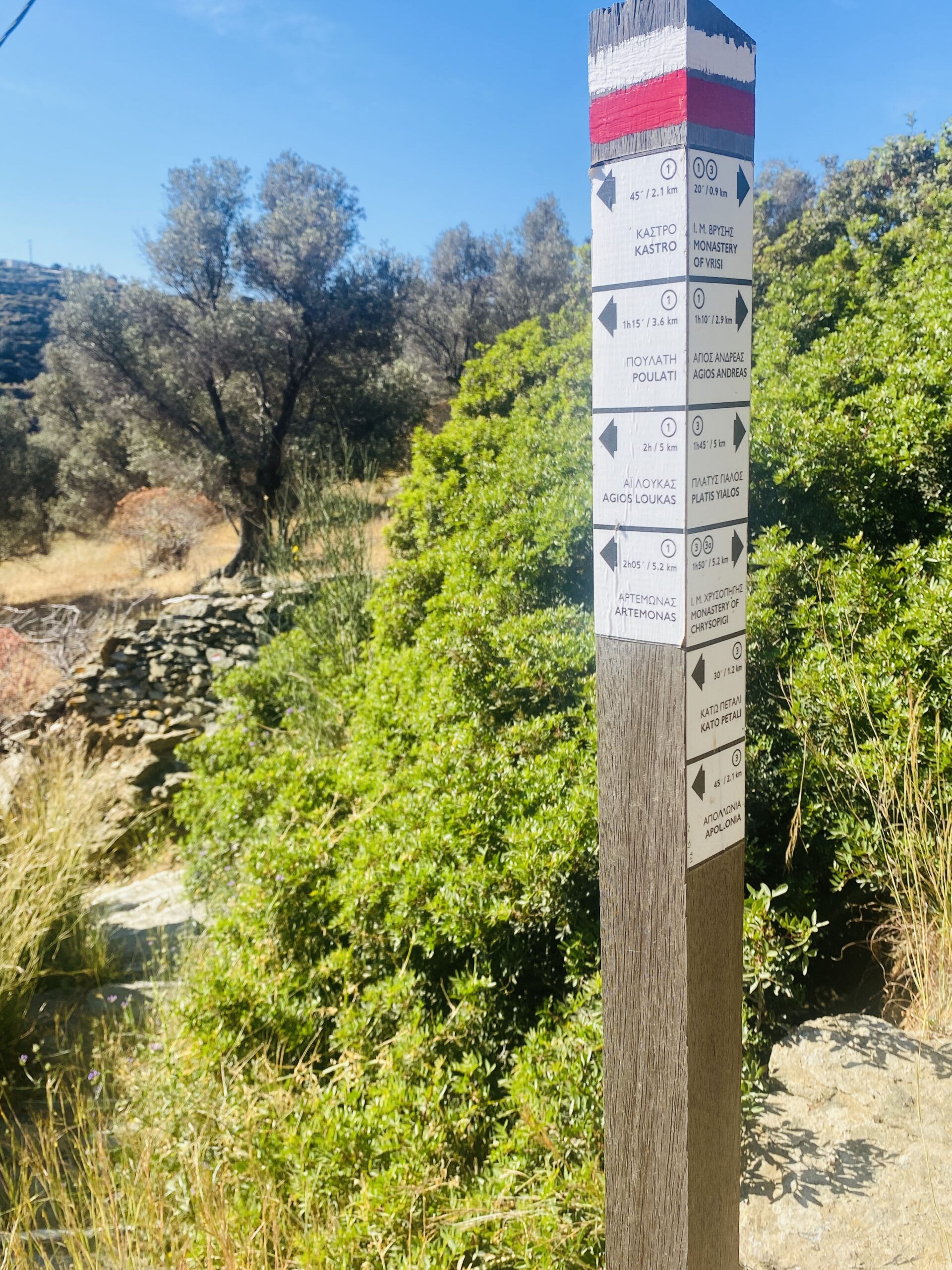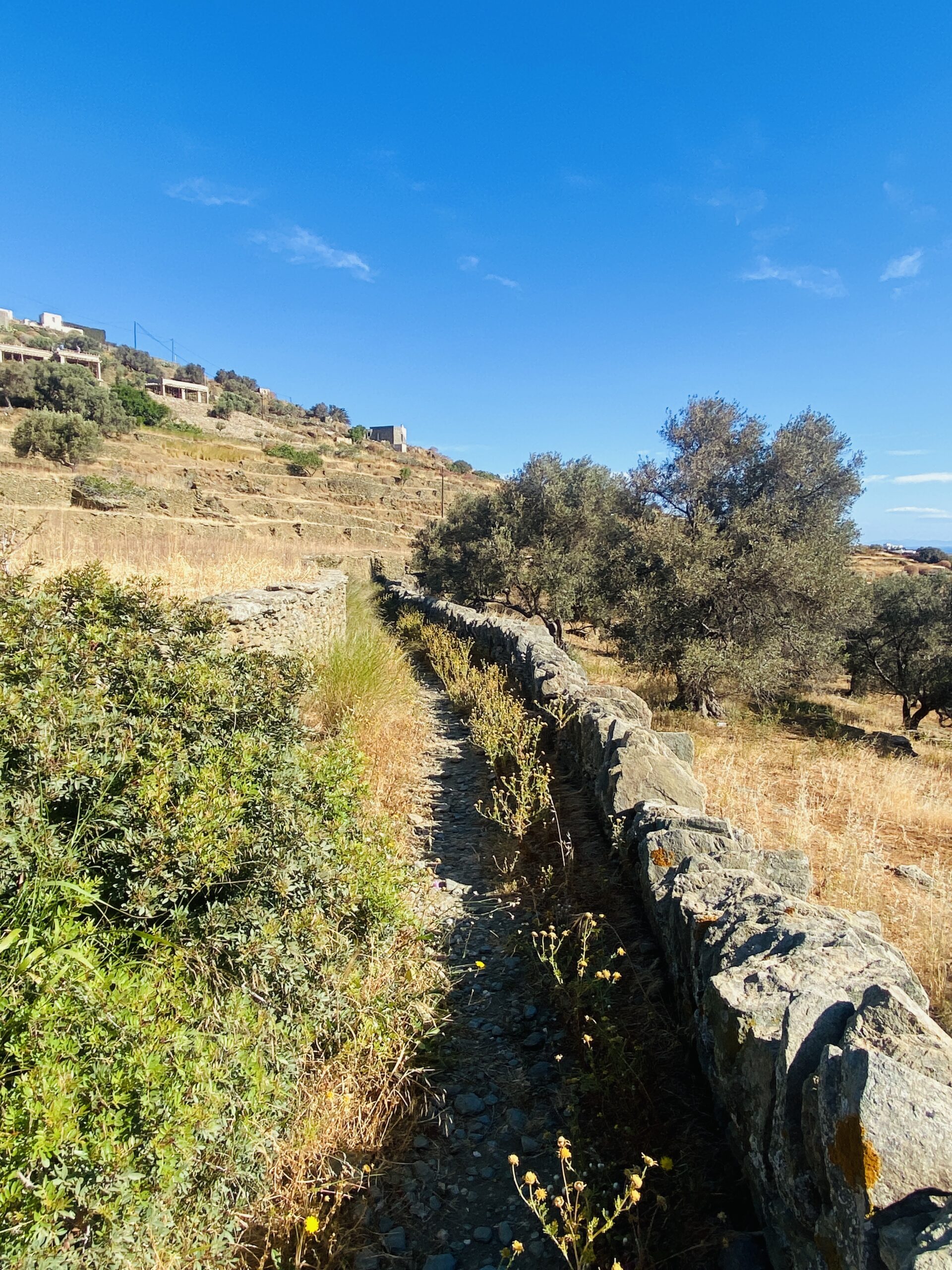 Η διαδρομή εντυπωσιάζει με τις παραδοσιακές ξερολιθιές που πλαισιώνουν το μονοπάτι, δημιουργώντας έναν φυσικό διάδρομο. Σε κάποια σημεία, καλοφτιαγμένα σκαλοπάτια διευκολύνουν την πορεία. Στον περίπατο θα συναντήσετε μικρούς κήπους με οπωροφόρα δέντρα και λαχανικά, που προσθέτουν χρώμα και ζωή στο τοπίο, αποδεικνύοντας ότι η παράδοση της γεωργίας εξακολουθεί να ζει στη Σίφνο.
