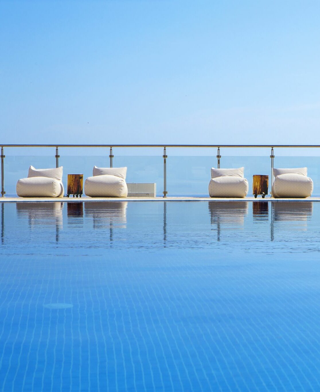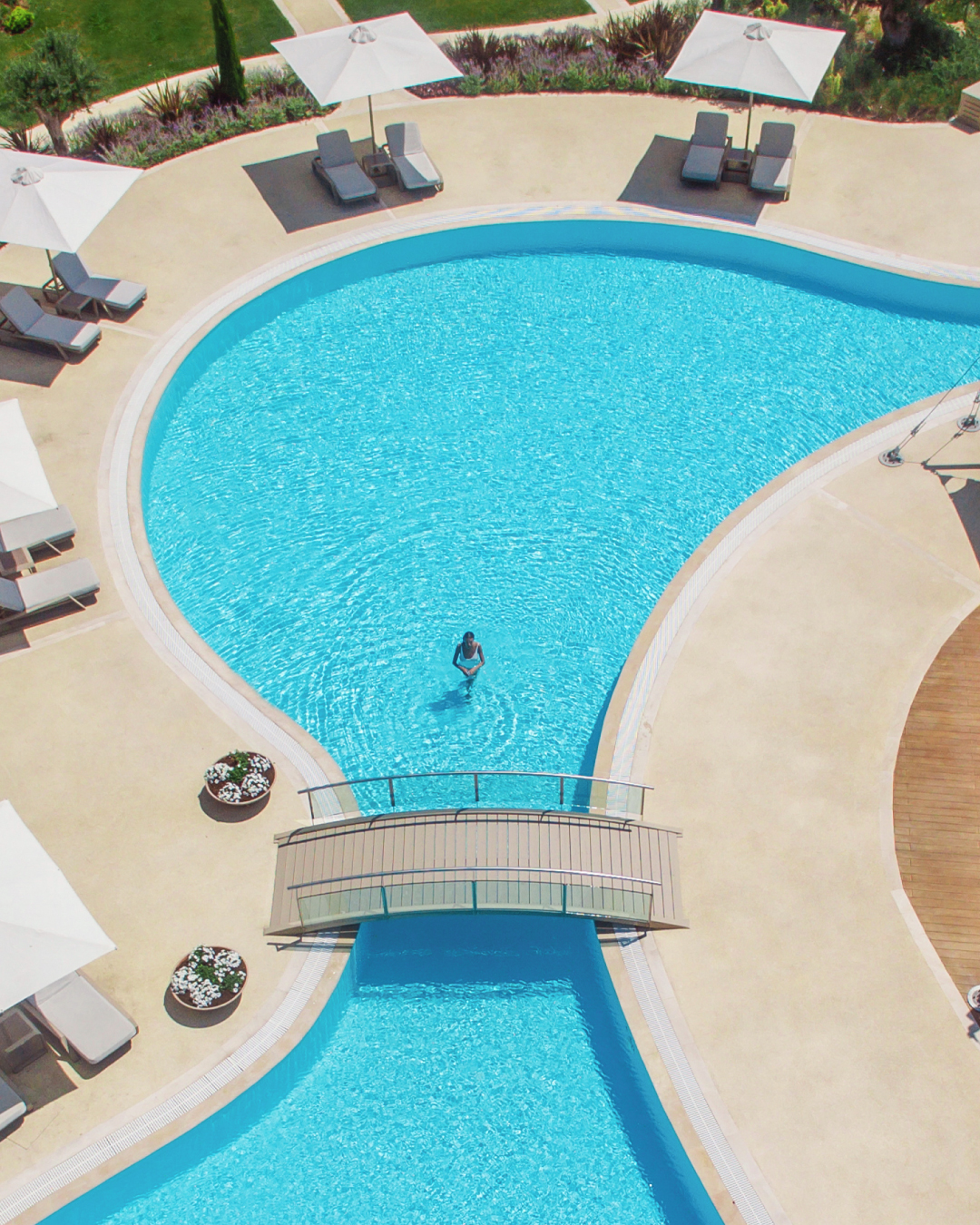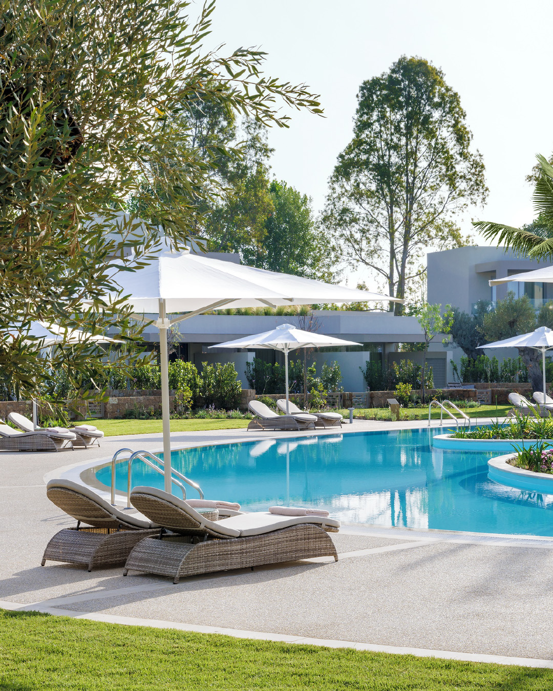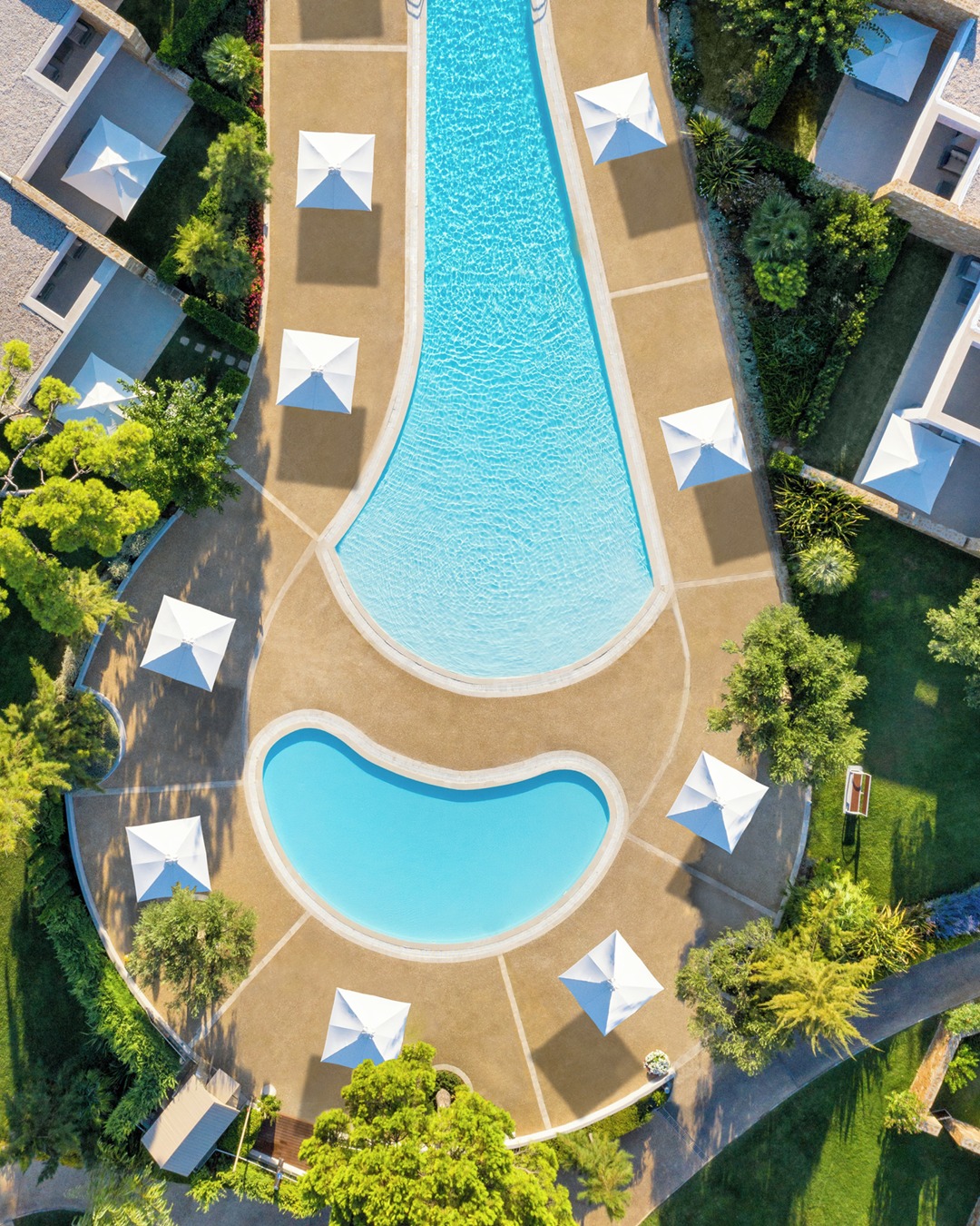 Design, χιούμορ, εκπλήξεις. Είναι τo τρίπτυχο που σφραγίζει το ύφος του resort πάνω στη σχεδόν ιδιωτική αμμώδη παραλία. Στην αγκαλιά του πευκοδάσους που φτάνει μέχρι τη θάλασσα, με κήπους γεμάτος λουλούδια και μίνιμαλ σχεδιασμό έχει αναφορές στη φιλοσοφία του feng shui και οικολογικές ευαισθησίες που εκφράζονται στην πληθώρα των φυσικών υλικών. Χαλαρή οικειότητα στους κοινόχρηστους χώρους που επαναλαμβάνεται και στα δωμάτια, με την cool διακόσμηση που φλερτάρει με μια σχεδόν παιδική αθωότητα σε συνδυασμό με design κομμάτια των Arad, Starck, O’ Ghery και Castiglioni.