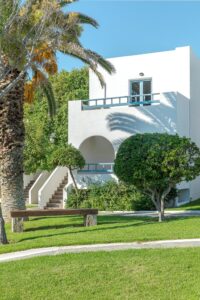Το «Skiros Palace» είναι ένα μεγάλο συγκρότημα παραδοσιακών λευκών κτιρίων ανάμεσα σε κήπους, όπου στεγάζονται τα δίκλινα, τρίκλινα και οικογενειακά δωμάτια.